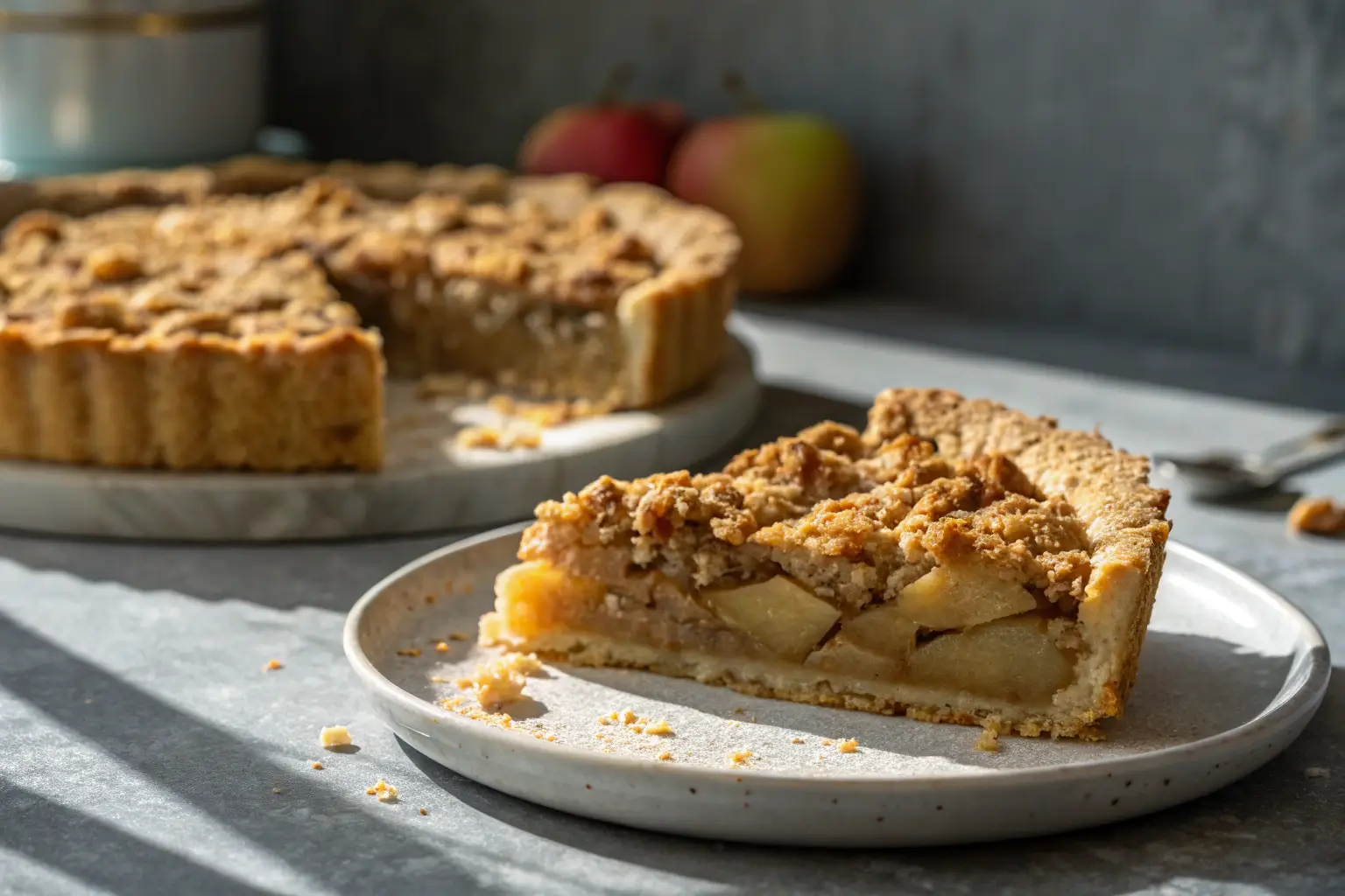 Dutch apple pie with golden oat crumble topping close-up