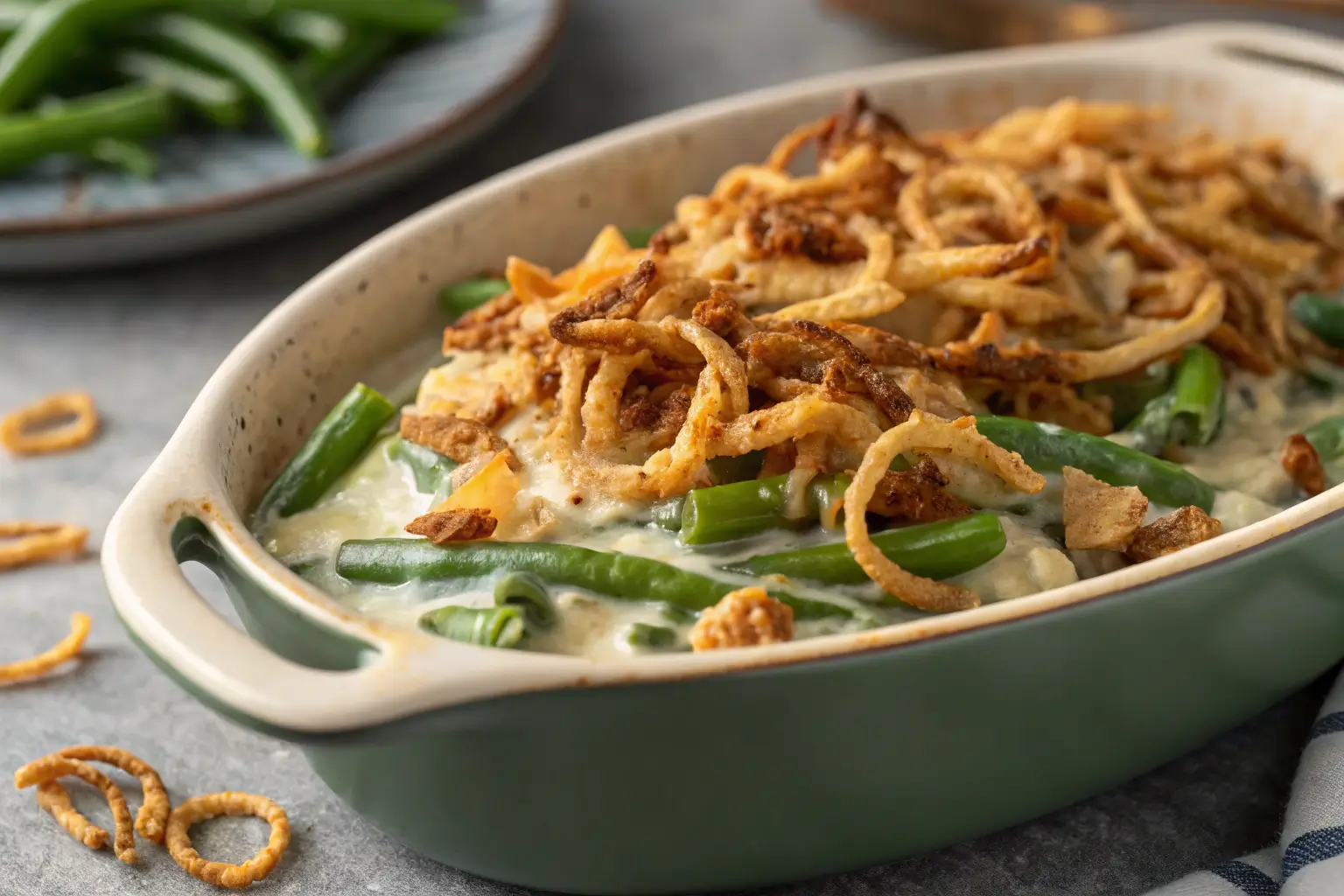 - Remove the casserole from the oven and sprinkle the crispy fried onions on top. This adds a fantastic crunch and flavor.