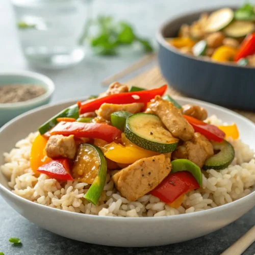 • Once the chicken is cooked, add the sliced bell pepper and zucchini to the skillet. Stir everything together and cook for another 5 minutes until the veggies are tender but still vibrant. This adds a beautiful color to your dish.