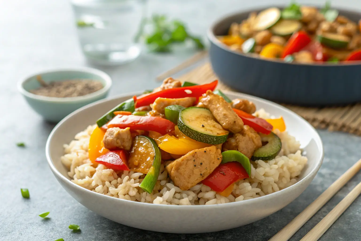Close-up of chicken stir-fry with veggies over brown rice.