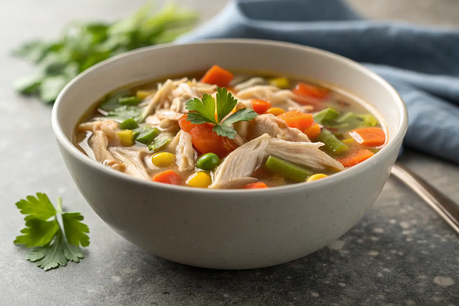 bowl of chicken vegetable soup with vegetables and parsley garnish