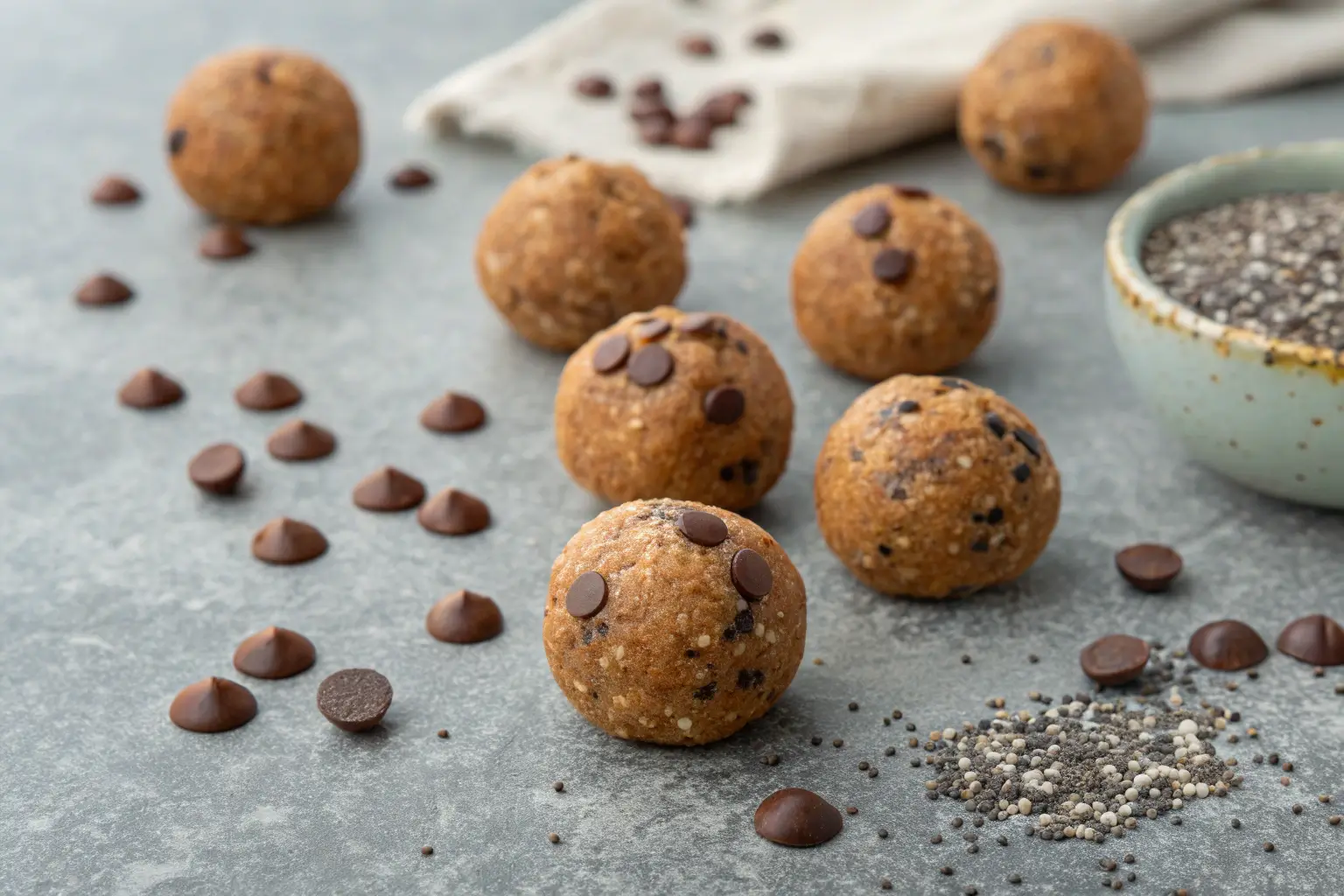 Close-up of Dairy Free Energy Balls on a gray surface.