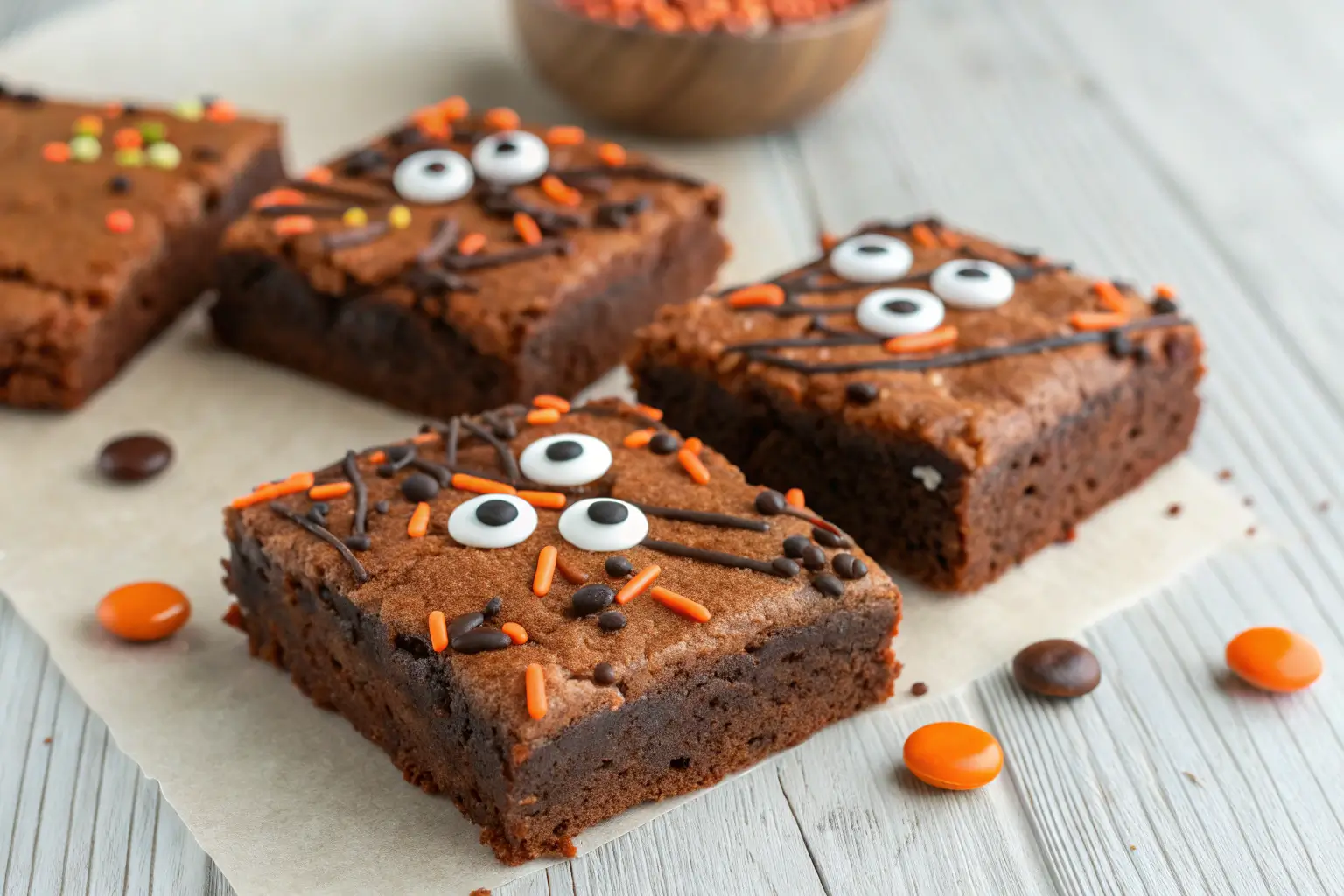 - Cut the cooled brownies into bite-sized squares. Decorate them with candy eyes and Halloween sprinkles.