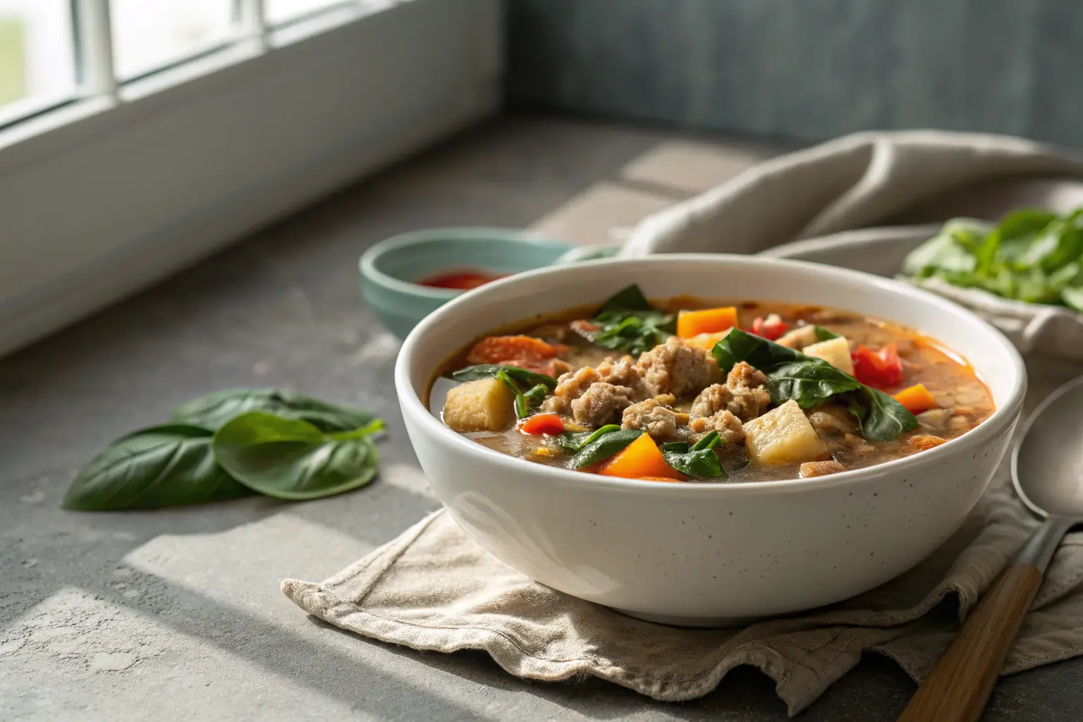 bowl of ground turkey vegetable soup with vegetables and spinach