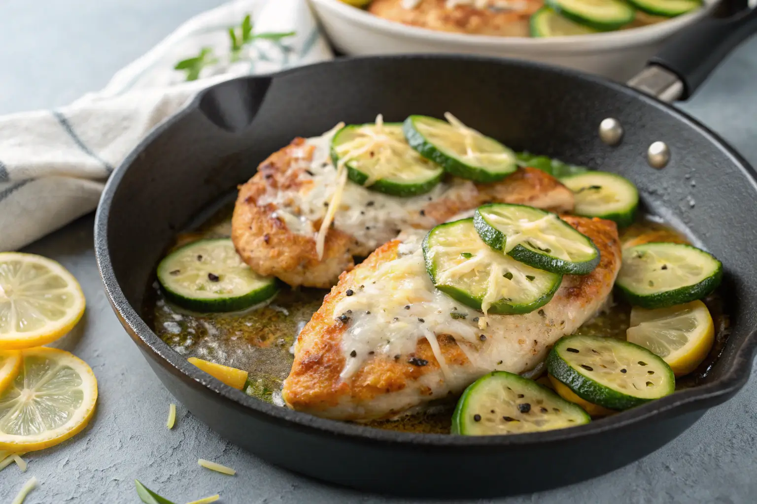 Skillet Lemon Parmesan Chicken with Zucchini on a gray background
