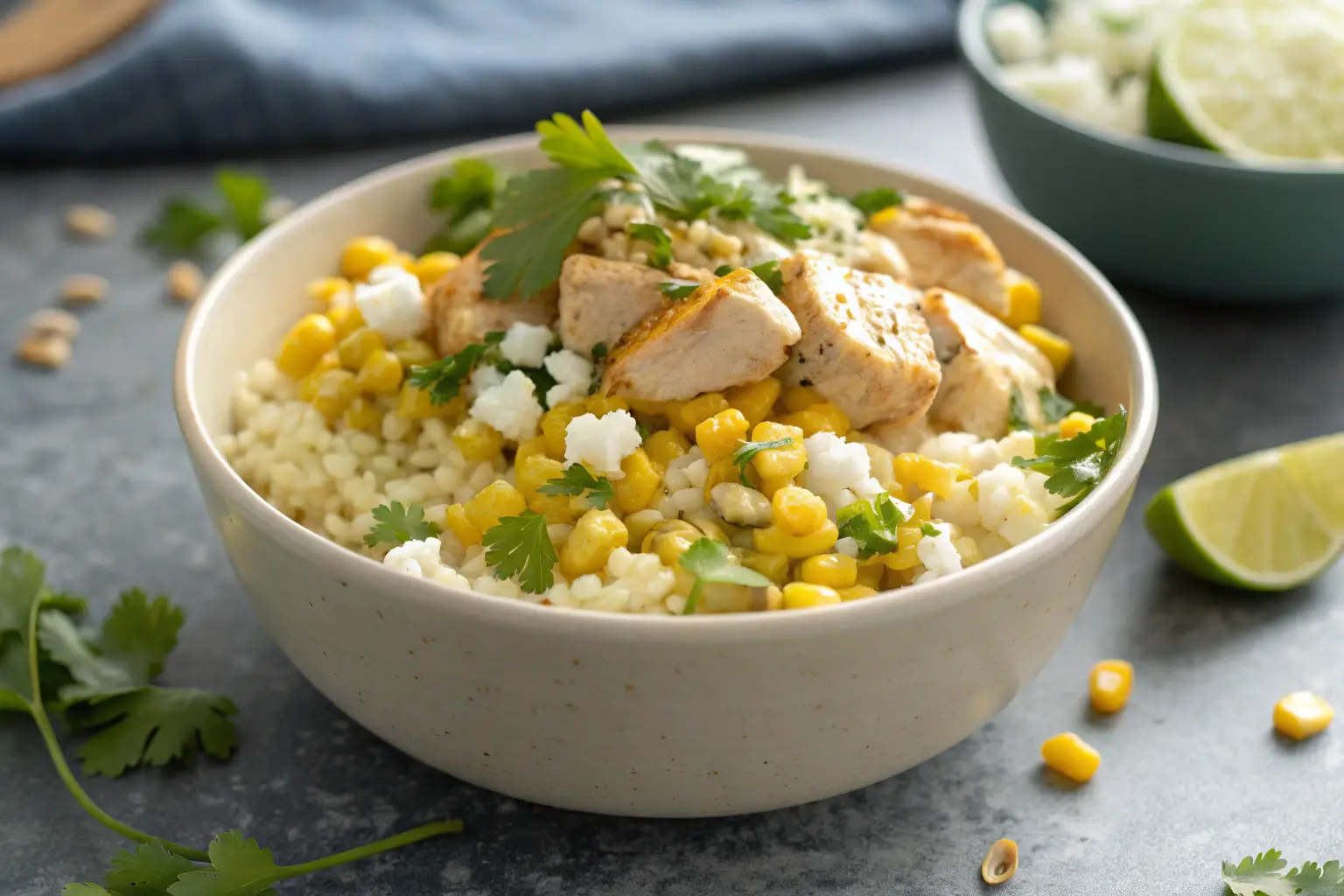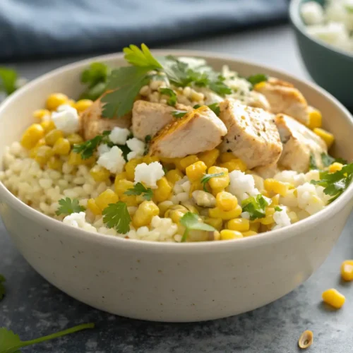 This street corn bowl is pure comfort food. The creamy, zesty corn pairs perfectly with tender chicken and fluffy rice, making it a dish everyone will love.