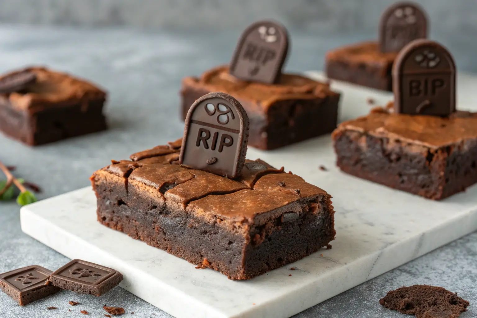 Close-up of Tombstone Brownies with chocolate decorations